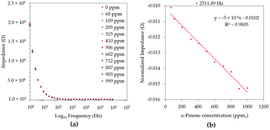 Impedance spectra of a (PAH/GO)5-film-based sensor (a,b) with its normalized impedance (Ω) spectra at a fixed frequency (2511.89 Hz) for detecting different α-pinene concentrations in air. The average and standard deviations of the respective impedance data of the duplicates were used for the normalization (Supplementary Materials, Table S9).