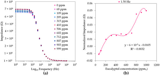 Impedance spectra of the TiO2 (100% O2)-film-based sensor (a) and its normalized impedance (Ω) spectra at a fixed frequency (1.58 Hz) for different eucalyptol concentrations in air (b). The dotted line is only a guideline. The average and standard deviations of the respective impedance data of the duplicates were used for the normalization (Supplementary Materials, Table S8).