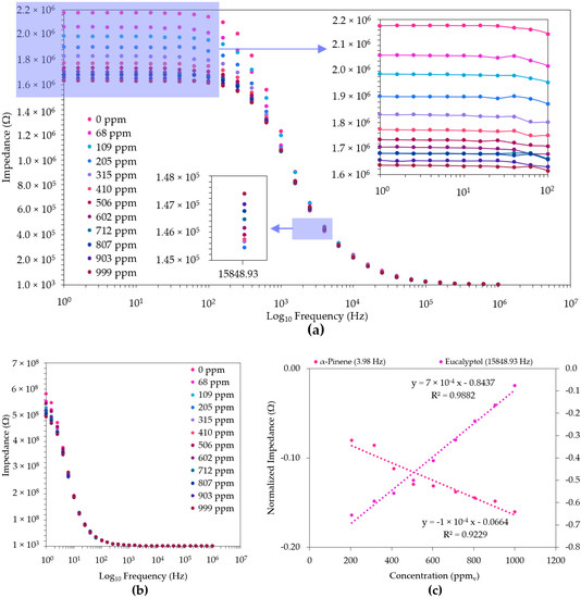 Impedance spectra of the ZnO (100% O2)-based film sensor obtained for eucalyptol (a) and α-pinene (b), and normalized impedance (Ω) spectra at a fixed frequencies (eucalyptol, 15,848.93 Hz; α-pinene, 3.98 Hz, (c) for the measurement of different concentrations in air. The average and standard deviations of the respective impedance data of the duplicates were used for the normalization (Supplementary Materials, Tables S6 and S14).