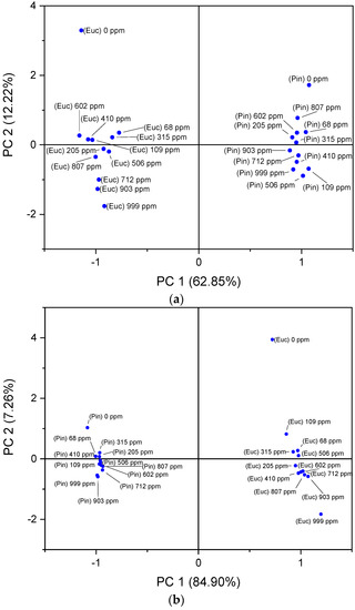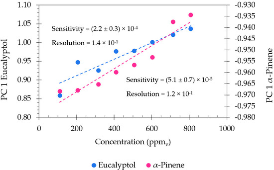 Furthermore, the factor scores of PC 1 obtained in Figure 5b were plotted as a function of the eucalyptol and α-pinene concentrations in order to identify the sensitivity and the resolution of the present device (Figure 6).