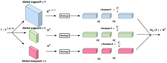 where denotes the output feature map, denotes the input feature map, denotes global average pooling, denotes global average pooling, denotesglobal maximum pooling, performs normalization operation on the feature map, denotes multilayer perceptron, is the compression rate, and denotes the activation function.