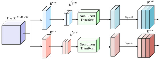 The structure of the position attention module is shown in Figure 6. To implement the coordinate information embedding, two one-dimensional feature encoding vectors are obtained by first decomposing the horizontal and vertical directions, respectively, through global average pooling. Then, the coordinate information of different dimensions is mapped by nonlinearity. Finally, the two feature maps containing and coordinates are output as follows: