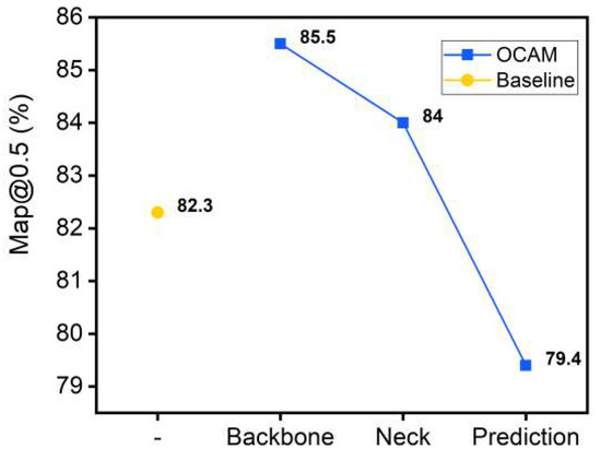 Figure 7 shows the network performance in Baseline (YOLOv5s) when the same attention layer is embedded in the three phases. It is observed that the baseline accuracy is 82.3%, and the network performance is affected when the attention layers are designed in different positions. The network performance is enhanced at the Backbone and Neck layers, and the network accuracy is improved. However, this performance decreases sharply with the depth of the network, which impairs the efficiency of the network, and the network shows a negative gain when the attention layer is embedded in the Prediction layer. As the network goes deeper, the attention layer appears as a representation bottleneck in the network, which affects the efficiency of the attention layer. The experiments show that this representation bottleneck is less affected when the attention layer is designed in shallow networks, and the network accuracy is relatively higher.