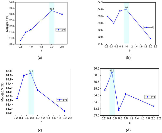 Figure 8 represents the study of the width and depth of the attention layer at the Backbone layer. By setting the attention layer in Backbone with different depths (indicated by ), two modulation factors were introduced to regulate the depth and channel ratio of a single layer, which can be obtained from the experimental results: (1) At the same depth, different channel ratios have an impact on the network performance, ignoring the large fluctuating values. As the channel ratio increases, the overall network accuracy at different channel ratios shows a mountain shape, which may be due to the network scaling benefit, where the network performance is optimal and the accuracy peaks when the depth and width are balanced. (2) With the increase in , the expressiveness of the network gradually increases and the highest accuracy that the network can achieve rises, while the highest accuracy can reach 86.2% and the deeper attention layer can effectively improve the network accuracy. (3) With the increasing of , the location of the peak also changes, peaks near 2 for , peaks near 1 for , peaks near 0.75 for , and peaks near 0.5 for .