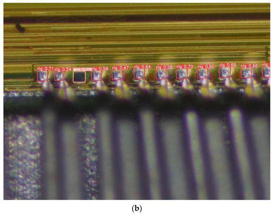 The actual detection of chip pads is shown in Figure 9 and Figure 10. As can be seen from the figure, compared to the original YOLOv5s, this algorithm not only detects more chip pads but also detects chip pads with larger masking areas. In addition, the detection rate of the improved model in this paper is higher than the original algorithm in the detection of the same chip pads. This means that, in practice, our detection results have better robustness and detection success rate.