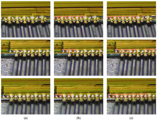 Comparison between our method and YOLOv5s model on-chip pad dataset. (a) Origin. (b) YOLOv5s. (c) Our.