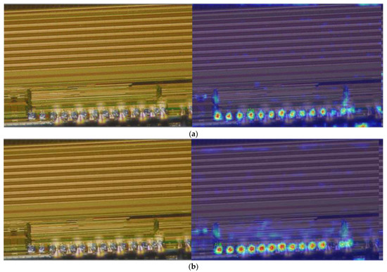 To further illustrate the inspection results, the paper visualizes the results using Grad-CAM [50]. As shown in Figure 11, the red part of the figure represents the degree of aggregation of features by the network, and the darker the color of the region indicates that the network pays more attention to the features in that region during the detection process, and vice versa, the region is ignored. From the figure, it can be seen that during pad detection, the method in this paper extracts more features, and the network pays more attention to the features of different targets. From the visualization results, it can be seen that the method in this paper can effectively enhance the features of small target pads during detection.