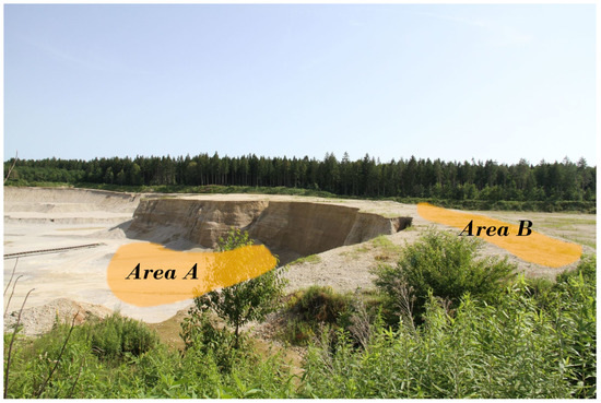 In this section, we describe in detail the measurement setup in the gravel pit and the obtained inversion results. These measurements were conducted in July 2021 for half a day in the gravel pit of the company “Glück Kieswerk Gräfelfing” in Planegg, Germany [16]. Figure 1 shows a view of the complete gravel pit, which lies several meters below the surface. Figure 2 depicts a site view over the gravel pit, with marked areas where measurements have been recorded. Area A lies inside the gravel pit, while Area B lies on top of the hillside next to the pit.