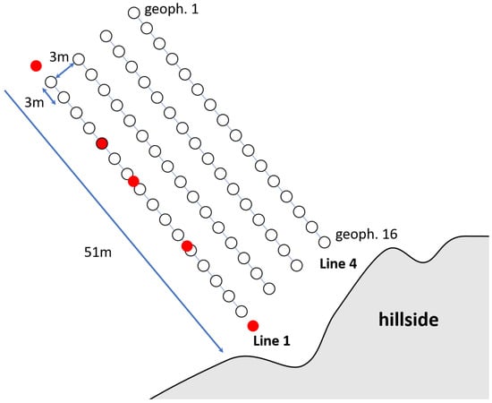 Schematic of the measurement setup in Area A of the gravel pit. White dots indicate the geophone positions, red dots indicate the shot positions, here shown for line array 1 as an example.