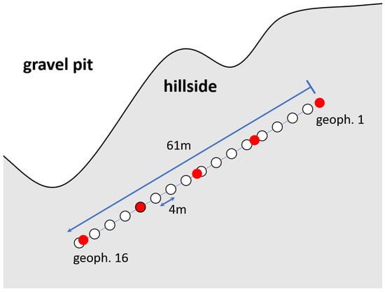Schematic of the measurement setup in Area B of the gravel pit. White dots indicate the geophone positions, red dots indicate the shot positions.