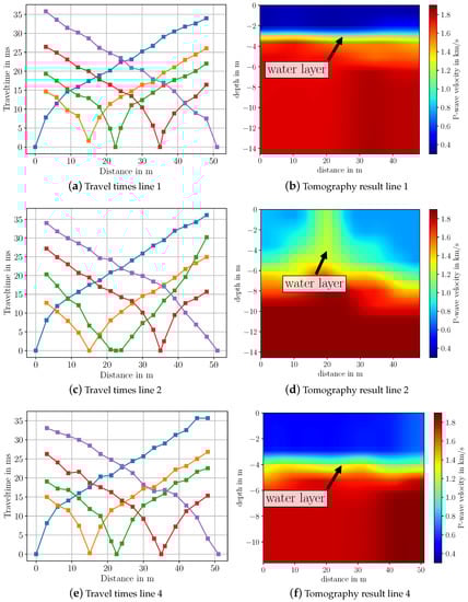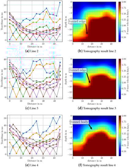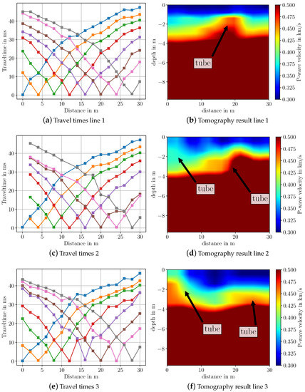Figure 13 shows the travel time curves and the corresponding inversion results obtained using travel time tomography in the software SeisImager. In order to see some features in the respective images, the P-wave velocity range has been limited to /. For all three lines, anomalies of circular shapes can be observed that indicate the locations of the underground tubes. The anomalies start at a depth of 1.5 to 2 , which indeed coincides with the available ground truth information; see Table 4. According to the available underground map and the schematic view in Figure 12, each line array “cuts” through multiple tubes. Therefore, multiple such features should be visible in the images where all of them lie at a similar distance. This is only partly visible in the images. For line array 1 and 2, the tube feature is at approximately 18 to 20 distance; see Figure 13b,d. In the image of line array 3, this feature is weakly visible at a distance of 25 ; see Figure 13f. However, here, another feature indicating a tube is visible at a distance of 5 . The same feature is weakly visible for line array 2 at the same distance; see Figure 13d. As we can observe, it is indeed possible to image certain features of the tubes. Due to the limits of travel time tomography, the spatial resolution is not sufficiently high to visually separate multiple tubes. Applying full waveform inversion could enhance the spatial separation in the images, such that the tubes become more distinctly visible.