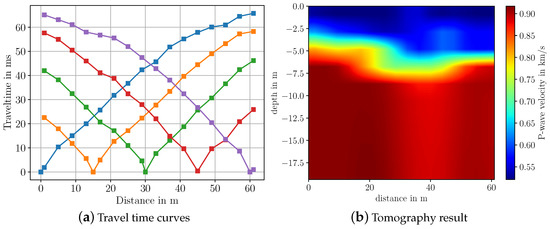 Near-surface seismic experiments are commonly performed using techniques from refraction or reflection seismology [11]. Here, a seismic source is used to inject mechanical waves into the ground. An array of geophones is placed nearby that captures reflected and refracted waves from the subsurface. Common seismic sources include hammer strikes, falling weights, explosive sources or seismic vibrators for larger depths. Based on the acquired waveform data, an inversion is performed that aims to estimate the spatial distribution of certain parameters of the subsurface, e.g., velocity, material density. Inversion methods range from simple techniques such as normal move-out [11] to more advanced imaging algorithms such as reverse time migration [12], travel time tomography [13] or full waveform inversion [14,15]. While reverse time migration produces images with respect to the reflectivity properties of the subsurface, travel time tomography and full waveform inversion reconstruct images regarding physical parameters such as velocity and density. In its simplest form, travel time tomography relies on first arrivals of incoming waves. Based on these, travel times are measured and compared to synthetically generated travel times based on a model of the subsurface. Travel times can be synthesized by solving the Eikonal equation. The obtained residual is then used to adapt the subsurface model until a minimum is reached, with the goal of bringing the subsurface model closer to the true model. In contrast with travel time tomography, full waveform inversion exploits the whole seismogram measured at the geophones. More specifically, it compares measured data to synthesized seismograms that are generated by solving the acoustic or elastic wave equation. This again provides residual data that are minimized to obtain a subsurface model close to the true one. Full waveform inversion provides an image with a higher spatial resolution compared to travel time tomography. However, the cost function in full waveform inversion is non-convex and the probability of ending up in a local minimum is high. Therefore, usually, a travel time tomography is performed first to obtain a rough image of the subsurface. After that, full waveform inversion is applied in order to obtain high-frequency details in the image.