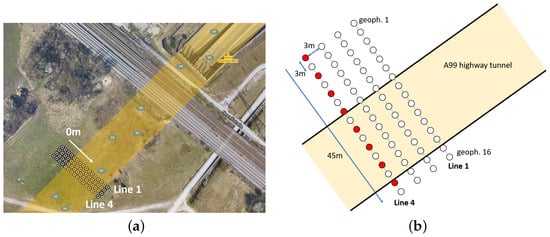 Google Maps and schematic view of the measurement site and setup over the highway tunnel. (a) Google Maps data from the measurements over the highway A99 tunnel with geophone positions. The underground highway tunnel is indicated by the yellow shape. (b) Schematic of the measurement setup over the highway tunnel. White dots indicate geophone positions, red dots indicate the shot positions, here exemplary for line array 4.