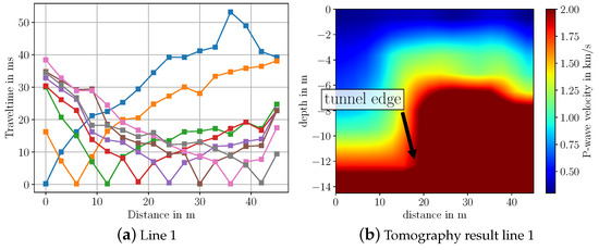 Based on Google Maps data and the measured GPS location of the start of each line array, we have ground truth information that the tunnel begins at distance from the starting position of each line array. From the reconstructed subsurfaces in Figure 10 and Figure 11 we observe that especially for line 1, 2 and 3, the starting position of the tunnel matches very well with this ground truth information. Here, the starting position of the tunnel lies between 15 to 20 . Regarding the velocities, their values lie in the expected range for saturated and dry sand, which lies between – [18]. For the tunnel, the estimated P-wave velocity lies in the range of 2 / to /. However, for concrete, which is the main material of the tunnel, the usual P-wave velocity lies higher at / [18]. To summarize, we conclude that we are able to image a large body such as this tunnel using a sledgehammer and geophone equipment.