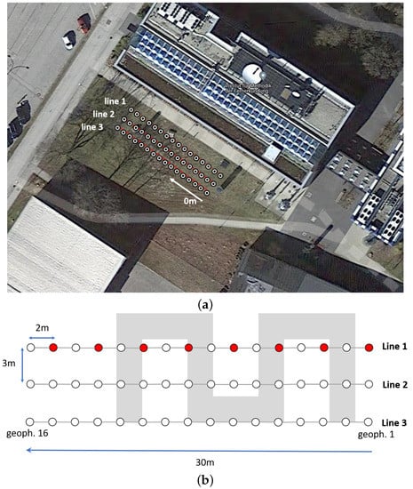 Google maps and schematic view of measurement site over tubes at DLR site. (a) Google Maps view with GPS locations of geophones. (b) Schematic view of measurement setup with underground tubes indicated in gray. White dots indicate the geophone positions, red dots indicate the shot positions, here exemplary for line array 1.