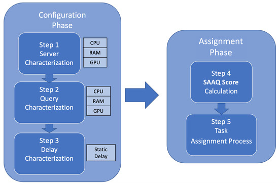 According to the issues outlined in Section 3, such as location awareness, energy awareness, and categorization of services and servers, we design a methodology to assign queries to servers available and capable of answering queries in the shortest time. Our proposed SAAQ-based methodology comprises the configuration phase, and the assignation phase, as shown in Figure 2. In the configuration phase servers and queries are characterized by considering three aspects: (i) the computational capabilities of the server in terms of CPU, RAM, and GPU capacities [5], which are the most representative resources of a computer (Step 1 in Figure 2); (ii) the computational cost of the query, defined in terms of CPU, RAM, and GPU needed for a query to be executed in a server (Step 2 in Figure 2); and (iii) the delay time between clients and servers (Step 3 in Figure 2). In the assignment phase, this methodology defines a metric called SAAQ score () to relate servers, queries, and network delay and indicate how suitable a server is to resolve a particular query (Step 4 in Figure 2) and a distribution query process that assigns queries to a server according to the SAAQ score values (Step 5 in Figure 2). The following subsections describe both phases and their respective steps.