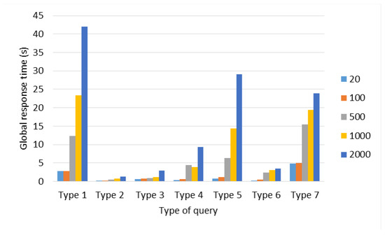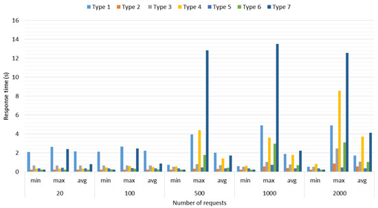 Regarding the results obtained in this test, it can be observed in Figure 9 and Figure 10 that the shortest average and total response times were obtained with the client located in the city of San Francisco, while the highest average and total response times were obtained with the client located in the city of Amsterdam.