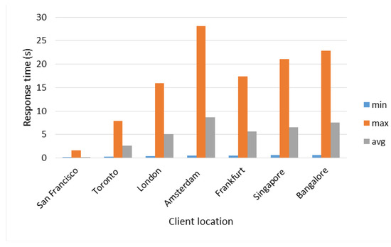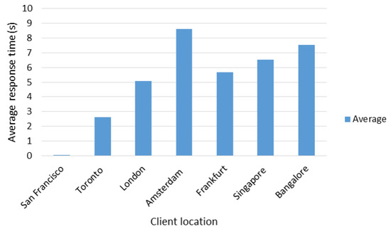 For the average response time, a behavior similar to the ones of the total times was observed (see Figure 11), where the longest time was obtained with the client in the city of Amsterdam and the lowest in the city of San Francisco.