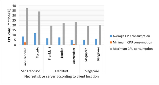 Finally, with respect to CPU consumption, a record is taken of the CPU activity in the server closest to the clients in each test. As can be seen in Figure 12, the Local Server in San Francisco registered the highest average CPU activity with 13% for the client located in Toronto. In Europe, for the client, the remote server in Frankfurt recorded the highest CPU activity with 7% average usage, while in Asia, in the scenario in Bangalore, the remote server in Singapore, recorded the highest activity with 11% average CPU occupancy.