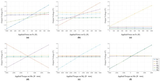 A coupling experiment was conducted to study the coupling effects among dimensions on the F/T sensor, and the experimental data were gathered for sensor calibration and model training. The coupling experiment is similar to the sensor calibration, which investigates the coupling output of all dimensions while the single dimension is loaded. Assuming represents the vector of voltage outputs of six dimensions, and indicates the measured load vector.