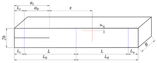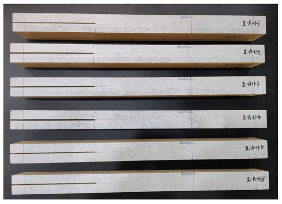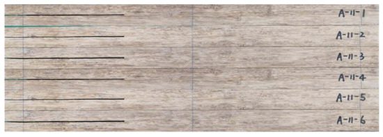 Figure 1 shows the fabricated engineered-bamboo specimens that were used in this study, with a length of 500 mm, a width of 55 mm, a height of 30 mm, and a prefabricated crack length of 160 mm. The number of specimens was 6. Three-point loading experiments were performed on the six specimens in turn, in which the specimens were subjected to shear stresses parallel to the crack surface and perpendicular to the leading edge of the crack to produce a relative slip-open (type II) crack along the direction of the prefabricated crack [20,21].