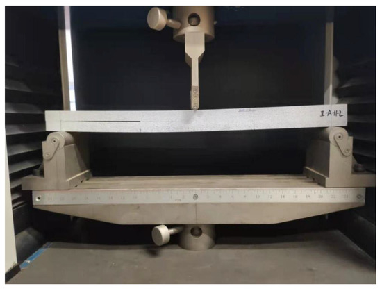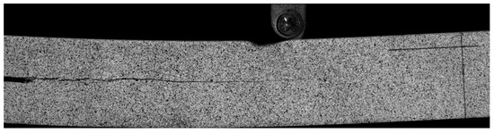 The second step was image acquisition before and after loading. A typical image acquisition system consists of a high-speed camera, a light source, an image acquisition card, and a computer. The specimens were installed so that the centerline of the two supports coincided with the left and right positioning lines, and the loading roller coincided with the center positioning line. The camera was placed directly in front of the specimen, and the camera was placed at a shooting angle perpendicular to the specimen’s speckle surface. The camera’s optical axis was flush with the surface of the specimen, and the lighting source was white light. The relevant parameters in the high-speed camera system control page were set; the sampling frequency of the high-speed camera was set to 20 sheets/s, the loading mode of the universal mechanical testing machine was set to constant loading, and the loading speed was set to 2 mm/min until obvious changes appeared in the test piece cracks or the applied load appeared to drop sharply when the loading was stopped. During the measurement process, speckle patterns on the surface of the tested parts were captured by the camera and stored on a hard disk for the next step of digital image correlation algorithm processing. Figure 3 shows the fracture experimental system of the engineered-bamboo specimens used in this study, Figure 4 shows the experimental process of three-point loading (type II fracture), Figure 5 shows the engineered bamboo speckle specimens, and Figure 6 shows an example of an engineered cracked bamboo speckle image.