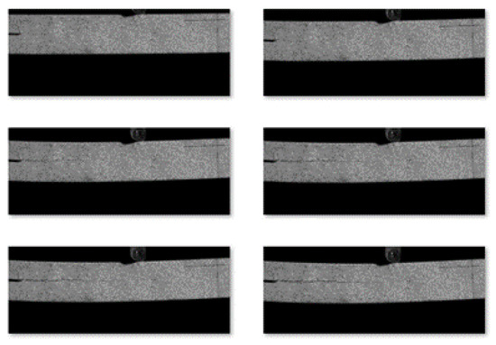 The dataset required for the experiment was obtained from the speckle images of engineered-bamboo material taken using the Thousand Eye Wolf high-speed camera of Hefei Fuhuang Junda Hi-Tech Information Technology Co., Ltd. in Hefei, China. There was a total of 1300 images, the length of the images was 4032 pixels, and the width was 1348 pixels. Some pictures from the dataset are shown in Figure 7.