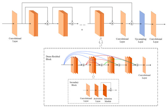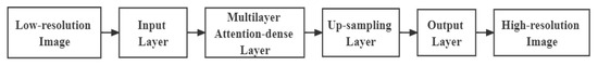 In this study, a modified attention-dense residual network (ADRN) was applied, and the flow chart of the algorithm is shown in Figure 8, including an input layer, a multilayer attention-dense layer, an up-sampling layer [24], and an output layer.