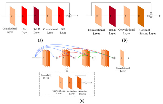 Comparison of residual block structures (a) residual blocks used by SRResNet and SRGAN; (b) residual blocks proposed by EDSR; (c) residual blocks used in this study.