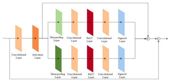 The specific structure of the attention module is shown in Figure 11. After the image passes through the convolution and activation layers, the attention module first performs the average pooling operation and the maximum pooling operation to obtain the feature vectors and , respectively, and then reduces the number of channels by the convolution layer. The convolution kernel size of the convolution layer is , as shown in Equation (3), at which point, the ratio of the number of channels output to the initial number of channels is , as shown in Equation (4):