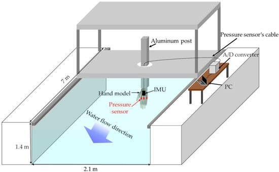 The measurement was performed in a water flume with high reproducibility of the flow velocity. Figure 3 shows a schematic illustration of the experiment. The water temperature was 27 °C during the experiment. The hand model was fixed to an aluminum post, with the fingertips facing the bottom of the pool. The hand model was submerged approximately 0.3 m below the water surface. The pressure around the hand model was measured while the flow velocity and direction of the hand model were changed. This experiment was performed at two different flow velocities (1.2 and 1.6 m·s−1). The flow velocity was measured using a flow velocity meter (VR-301, KENEK Co., Ltd., Tokyo, Japan). The orientation of the hand model toward the water flow was changed manually. The water flow direction from the little finger side was defined as 0°, that perpendicular to the palm was defined as 90°, and that from thumb side was defined 180°; these directions changed every 30°. Measurements were first performed using the IMU and pressure sensors attached (referred to herein as “with the IMU”); subsequently, the IMU was removed and only the pressure sensors were attached (referred to herein as “without the IMU”). The measurements were performed for 10 s at each velocity and water flow direction, and were repeated 10 times. Pressure was recorded at a sampling rate of 200 Hz. The signal output from the pressure sensors was recorded on a personal computer (PC) using an A/D converter (EDX-100A, Kyowa Electronic Instruments Co. Ltd., Tokyo, Japan). Prior to the measurement, all the pressure sensors were confirmed to indicate a less-than-2.5% error toward theoretical hydrostatic pressures when submerged into calm water.