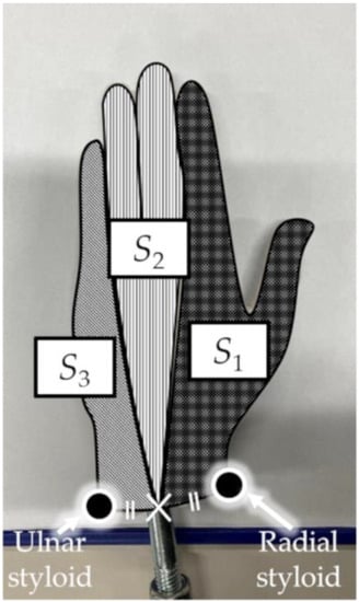 The acting on the hand model was obtained by multiplying the hand model area (m2) by the pressure difference (N·m−2) between the palm (p1, p2, and p3) and dorsal (d1, d2, and d3) sides of the hand model []. The hand model area was measured by dividing the hand plane into three components (S1, S2, and S3) from photographs of the hand model using image-processing software (ImageJ, NIH, Bethesda, MD, USA) (see Figure 4). Subsequently, was calculated as the product of the pressure difference and the hand model area in each hand plane, followed by their summation, as shown in Equation (1).