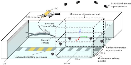 Figure 5 shows a schematic illustration of the experimental setup. The experiment was conducted in an indoor pool (length: 50 m; width: 25 m; depth: 2.0 m; water temperature: 27.5 °C). The participants performed 25 m of front crawl swimming twice at each of nine different swimming speeds from 0.8 to 1.6 m·s−1. The swimming speed was indicated to the participants via an underwater lighting pacemaker (Swimming Pace Maker System, Takei Scientific Instruments Co. Ltd., Niigata, Japan) installed at the bottom of the pool. Prior to each measurement, the participants stood in a position with both arms directed toward propulsion above the water and their palms facing down and parallel to the water surface. The participants began swimming by performing a wall push-off at the supervisor’s discretion. The rest time between each test was at least 1 min, where the rest time was longer in the latter half of the test when the swimming speed was higher. When the measurement could not be performed precisely, the same measurement was repeated.