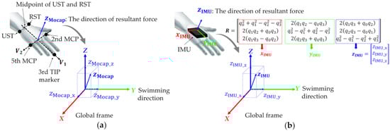 To estimate the propulsive force generated by the hands, hand orientations were obtained using an underwater motion-capture system and an IMU. For the method using an underwater motion-capture system, the hand orientations were calculated using the coordinates of markers attached to the hands, based on procedures reported previously [,] (Figure 6a). The vector from the midpoint of the UST and RST to the third TIP marker is defined as V1. For the right hand, the vector from the second to the fifth MCP is defined as V2. By contrast, for the left hand, the vector from the fifth to the second MCP is defined as V2. The hand orientations, , are unit vectors calculated by the cross-product of V2 and V1 and normalized by its own norm. Therefore, the propulsive force estimated using the underwater motion-capture system and pressure sensors () can be determined using Equation (2).