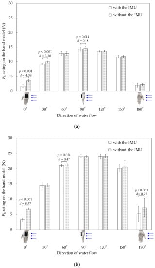The most significant difference was observed at 0° for both flow velocities. Therefore, the pressure at 0° was prioritized in this study. Table 1 and Table 2 show the pressures on the palm and dorsal sides of the hand model at 0°. Significant differences were indicated between the pressure recorded with and without the IMU in all six pressure sensor positions. In particular, the effect size of d3 was the largest in the six pressure sensors for both flow velocities (1.2 m·s−1, d = 9.03; 1.6 m·s−1, d = 8.81). This suggests that when water flows from the little finger side, the hand-mounted IMU affects the pressure at d3.