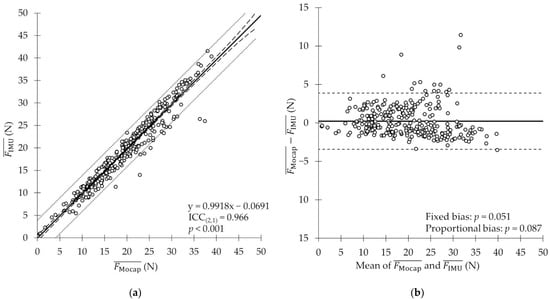 A comparison of the mean values shows that the and of all 297 strokes in Experiment 2 were 19.59 ± 7.66 and 19.36 ± 7.86 N, respectively. was 0.23 N (relative error: 0.4%), and was ±2.08 N. The ICC(2,1) between and was 0.966 (95% confidence interval: 0.958–0.973, p < 0.001), which indicates good agreement between them (Figure 8a). The Bland–Altman analysis showed neither fixed (p = 0.051) nor proportional (p = 0.087) biases between and (Figure 8b).