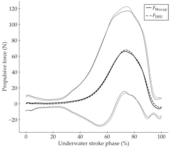 4.2. Agreement between Propulsive Force Estimation Using IMU and Underwater Motion-Capture System
