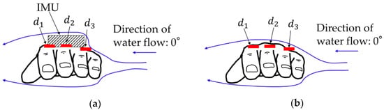 In Experiment 1, the effect of a hand-mounted IMU on the acting on the hand was investigated by changing the flow velocity and water flow direction relative to the hand. The results showed that the hand-mounted IMU affected ; however, the effect of the hand-mounted IMU varied depending on the water flow direction. In this study, the water flow direction from the little finger side was set to 0°, and the water flow direction from the thumb side was set to 180°. From 60° to 150°, the effect of the hand-mounted IMU on was negligible or small (Figure 7). For both flow velocities, decrements in the resultant force were observed at the water flow direction of 0° from the hand-mounted IMU, and significant pressure differences were observed between the cases with and without the IMU at each pressure sensor position (Table 1 and Table 2). The difference in pressure is attributable to the change in the water flow around the hand model owing to the hand-mounted IMU. Figure 10 shows a conceptual diagram of the difference in water flow with and without the IMU when the water flow direction was 0°. The pressure was predicted to increase owing to the decreased flow velocity due to flow obstruction by the hand-mounted IMU. In this experiment, the pressure at d3 without the IMU was lower than that with the IMU, and the effect of the hand-mounted IMU on the pressure at d3 was the most prominent among the pressure sensor positions investigated. Therefore, mounting the IMU on the dorsal side of the hand may change the flow and pressure, particularly on the dorsal hand side. However, assuming front crawl swimming, the water flowing from the little finger side was at the end of the underwater stroke phase, immediately before the hand exited the water. The phase immediately before the hand exited the water was confirmed to be short throughout the entire underwater stroke phase []. In addition, swimmers typically maintain the angle of attack of their hands at 50°–70° in three swimming styles: front crawl, backstroke, and butterfly [,]. Therefore, the effect of using an IMU in front crawl swimming on would be insignificant.