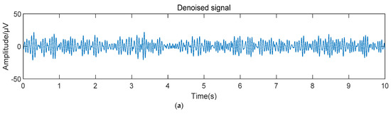 In the early stage, the research object is mostly the artifact removal of multi-channel EEG signals, mainly including regression and filtering methods [2,3]. These two methods require reference channel signals. If there is no available reference signal, BSS is the most commonly used method, and research shows that the ICA algorithm is more suitable for removing EOG artifacts [4,5]. At the same time, wavelet transform is also very effective in removing EOG artifacts [6]. Compared with EOG artifacts, it is more difficult to remove EMG artifacts, on the one hand, because EMG lacks reference signals, and on the other hand, it is characterized by a high amplitude, a wide frequency band, and mixing with EEG [7]. Therefore, some researchers found that the ICA algorithm could not effectively remove EMG artifacts from EEG signals [8,9]. In recent years, canonical correlation analysis (CCA) [9,10] and independent vector analysis (IVA) [7] have been used to remove EMG artifacts and have demonstrated their superior performance to ICA in certain aspects; however, the ICA algorithm is still recognized as the most widely used blind source separation algorithm [11]. At present, although there is no specific method that can effectively remove artifacts from all types of EEG signals; the BSS method is still the most extensive and effective method for processing EEG signals. Similar to other methods, BSS also has its limitations. This method requires the number of channels of the source signal and a small number of channels will reduce the separation effect [12]. Therefore, it is generally not directly used for the signal with few channels or a single channel. Nowadays, with the development of portable EEG acquisition systems, in many cases, only few-channel or even single-channel EEG can be collected. Especially in biomedicine, portable EEG acquisition systems will be more suitable for social needs. In order to overcome the limitation that BSS cannot be directly applied to single-channel EEG, researchers usually introduce a signal decomposition method, that is, the original EEG is decomposed into multiple signal components as the input of BSS, then the artifacts are identified and removed, and finally the pure EEG is reconstructed. Mijovic [13] combined EMD with ICA, first performed EMD decomposition on EEG, and used the generated eigenmode function as the input of ICA to successfully separate the artifact components in a single-guided EEG. However, signals decomposed by the EMD method will have modal mixing phenomenon, resulting in the incomplete removal of artifacts or the removal of useful information by mistake. Subsequently, its improved algorithm EEMD was proposed [14], and the literature [15] proposed the method of combining EEMD and BSS to remove artifacts in a single-channel EEG, however residual noise and other phenomena may still occur [16]. The literature [17] proposed a method combining singular spectrum analysis (SSA) and ICA to deal with the problem of multiple artifacts and achieved certain results. Generally speaking, most of the current methods are for the removal of a single artifact, but there are few studies on the removal methods for solving multiple artifacts at the same time.