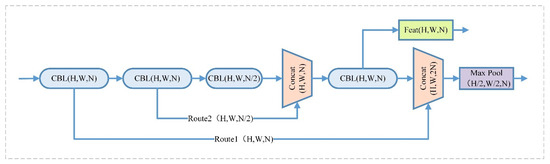 CSPDarknet53-tiny of the backbone network consists of 3 CBL (DarknetConv2D_BN_Leaky) modules and 3 RB (Resblock_body) modules. The CBL module contains a 2D convolutional layer, a batch normalization layer, and a LeakyReLU activation function. The CSPNet (Cross Stage Partial Network) is introduced into the RB module, so that the network structure can achieve richer gradient combination information while reducing the amount of computation. First of all, the pictures passed into the network will be resized into a unified format of 416 × 416 × 3 in size. Through two convolution operations with a convolution step size of 2, normalization, and activation function processing, a 104 × 104 × 64 feature map is obtained. Then, the feature map is passed into the CSPNet structure. The residual block in the CSPNet structure is divided into two parts [19]. Among them, the residual edge part is directly connected to the end, and the backbone part continues to stack the residual blocks, as shown in Figure 2, where H, W, and N represent the height, width, and channel number of the feature map, respectively.