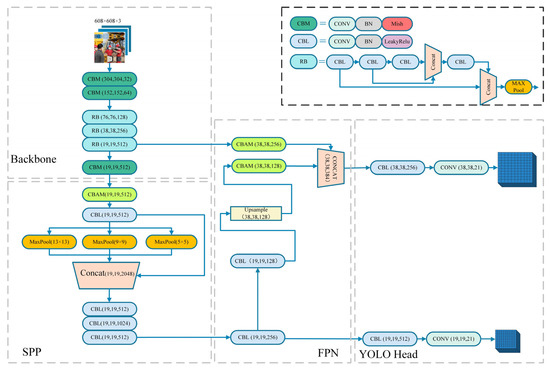 In order to make the model adapted to the complex scene of the workshop and improve the detection accuracy, we first changed the activation function of the backbone network to the Mish activation function. Secondly, the Convolutional Block Attention Module (CBAM) and the Spatial Pyramid Pooling (SPP) structure were introduced. Finally, in the training process and the data preprocessing stage, label smoothing strategy, K-Means++ clustering algorithm, and Mosaic data enhancement were introduced to improve the robustness and accuracy of the model. The framework of the real-time detection model for safety helmet wearing based on SCM-YOLO is shown in Figure 3.