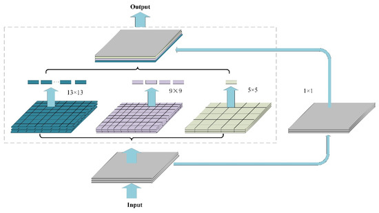 Inspired by the SPP structure, this paper performed the SPP pooling operation on the output of the backbone network, as shown in Figure 6. In specific operations, pooling operations based on different separate-block are applied to the input feature map, in which the pooling operation module consisted of three maximum pooling layers; the pooling window sizes were 13 × 13, 9 × 9, and 5 × 5; and the stride was 1. To ensure that the final feature dimensions were consistent, each pooling window extracted one feature as a dimension. The original global feature information without the pooling operation was fused with the local feature information with different granularities after the pooling operation. In this way, the multiscale fusion of local features and global features was realized, which improved the receptive field of the model and also enhanced the ability of the feature layer to express the object, thereby improving the detection accuracy of the model.