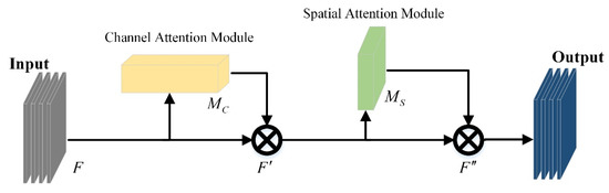 The attention mechanism is a signal processing mechanism imitating the human brain, and this strategy has good adaptability and gain for computer vision tasks [25]. The CBAM module also obtains the importance level of pixels through supervised learning [26] and assigns information weights in the channel and space dimensions, as shown in Figure 7.