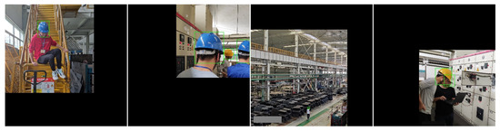 The safety helmet wearing dataset comes from Liuzhou Wuling Automobile Co., Ltd. (Guangxi Automobile Group) and contains 2580 images. Before the experiment, LabelMe was used to manually mark the object. The dataset was then expanded to 11,983 samples using Mosaic data enhancement. The dataset was divided into a training set, validation set, and test set according to the ratio of 6:2:2. The training set included 7189 photos, the verification set included 2397 photos, and the test set included 2397 photos. Part of the dataset images and LabelMe annotations are shown in Figure 13.