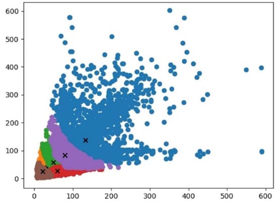 Among them, the set of input data points is the coordinates of the ground truth box in the dataset, and k is the number of classifications. Since the output feature map of YOLOv4-tiny has 2 scales, the sizes are 26 × 26 and 13 × 13, respectively. Each grid on the feature map of the scale uses three anchor boxes for predictions, thus corresponding to 6 anchor boxes. Since the size of the new anchor box input into the model is more adaptive with the ground truth box size in the dataset, the prediction box generated during the model training process is more accurate, which will help the model to converge quickly. In this study, the six new anchor boxes obtained by the K-Means++ algorithm are: (33, 40), (59, 27), (49, 58), (78, 83), (98, 67), and (133, 137). The cluster center map after K-Means++ processing is shown in Figure 12.