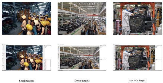 It can be seen from Table 1 that when the detection speed FPS of the SCM-YOLO algorithm met the actual application requirements, the mAP reached 93.1%, which was 4.7 percentage points higher than that of the YOLOv4-tiny algorithm. Among them, the AP of head and safety helmet detection increased by 5.8% and 3.7%, respectively, but the detection speed decreased slightly. Compared with the YOLOv3 algorithm, the mAP was increased by 0.6%, and the detection speed was significantly improved. Compared with the YOLOv3-tiny algorithm, the mAP was increased by 13.2 percentage points, and the detection speed was also slightly improved. Compared with YOLOv3 and YOLOv3-tiny, mAP was increased by 0.6% and 13.2%, respectively. Compared with the YOLOv4 and YOLOv5 algorithms, the SCM-YOLO algorithm has almost three times the detection speed of the YOLOv4 and YOLOv5 algorithms when the mAP is not much different. As a relatively mature algorithm in the YOLO series of algorithms, the YOLOv5 algorithm has excellent detection accuracy. In this experiment, mAP can reach 96.7%. However, as far as the practical application scenarios of this study are concerned, the detection speed cannot meet the application requirements of real-time detection. However, on the whole, the SCM-YOLO algorithm proposed in this paper has a good comprehensive performance in detection accuracy and speed, which was enough to meet the task requirements in various complex scenarios.
