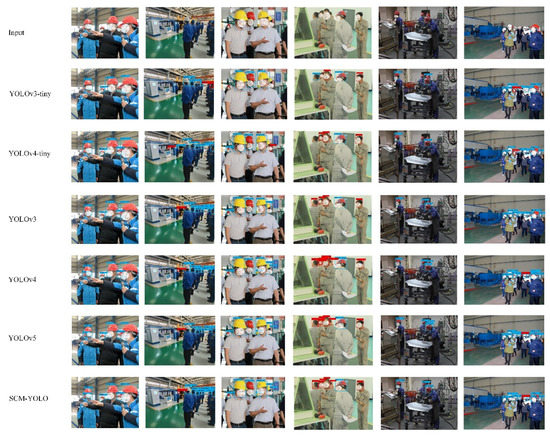 In order to more intuitively verify the object detection effect and model robustness of the SCM-YOLOV4 algorithm in different complex scenarios, this paper selected the same test dataset for the experimental comparison of YOLOV3-tiny, YOLOv3, YOLOV4-tiny, YOLOv4, YOLOv5, and SCM-YOLO. The experimental results are shown in Figure 15. There are a total of six targets in the fourth test image, including one positive sample (with helmet) and five negative samples (without helmet). The YOLOv3-tiny algorithm detected a total of four targets, two missed detections, and one false detection. The YOLOv4-tiny algorithm detected a total of four targets, two missed detections, and zero false detections. The YOLOv3 algorithm detected a total of five targets, one missed detection, and zero false detections. The YOLOv4, YOLOv5, and SCM-YOLO algorithms correctly detected all the targets. In the sixth test image, the detected target scene is a dense scene. The YOLOv3-tiny algorithm and the YOLOv4-tiny algorithm had serious missed detections and false detections, and the YOLOv3 algorithm had serious missed detections. Although the YOLOv4, YOLOv5, and SCM-YOLO algorithms had a small number of missed detections, the overall detection effect was excellent. It can be seen from the above that, in the YOLOv3-tiny algorithm, there were serious false detections and missed detections for small objects and occluded objects. The YOLOv3 and YOLOv4-tiny algorithms improved the detection effect of occluded objects, but the problem of missed detection was still serious compared with the YOLOv3-tiny algorithm. Among them, the YOLOv4, YOLOv5, and SCM-YOLO algorithms had excellent performances in all aspects of the test set, and the detection accuracy of small objects and occluded objects was relatively high.