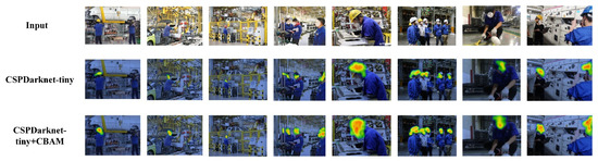 It can be seen from Table 2 that the model with the CBAM attention mechanism had a higher detection accuracy than the other models. In order to explore the specific impact of CBAM on the model, this paper used Grad_CAM (Gradient-weighted Class Activation Mapping) to visualize the performance of the CSPDarknet53-tiny network and the CSPDark-net53 network with the CBAM attention mechanism. The results are shown in Figure 17.