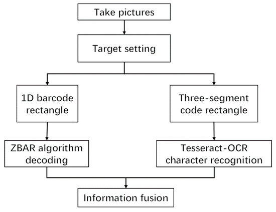 After obtaining the rectangular box containing three sections of code information, we used OpenCV and Tesseract together to obtain text recognition. As shown in Figure 8, after the image is first input, we use OpenCV’s EAST text detector to detect the text in the image. The EAST text detector provides the bounding box coordinates of the text ROI. We extract each text ROI and input these into the LSTM deep learning text recognition algorithm of Tesseract V4. Finally, the output of the LSTM provides the actual OCR result, which is a string. After obtaining the string, we find the sorting information represented by the corresponding number through the database.