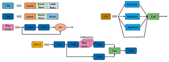 In deeper learning, the high-level network layer has a large receptive field, so it has a strong ability to represent semantic information. However, the feature map has low resolution and poor ability to represent spatial information. The receptive field ratio of low layer network layer is small, in contrast to that of high layer network layer. Therefore, spatial pyramid pooling SPP [25] was proposed to deal with these problems [26]. This structure is mainly about the maximum pooling of 5 × 5, 9 × 9 and 13 × 13 with different sizes after convolution, batch normalization and activation function. The maximum pooling of the characteristic graph is joined together to change the channel to 2048 with the original size unchanged. Such operation by integrating different receptive fields can enrich the semantic information of feature maps and effectively improve model performance [27]. At the same time, we know that CSPDarknet53, the backbone feature extraction network of YOLOv4, is the key factor in obtaining good results with this network. The cross-stage part network (CSPNet [28]) is a structure proposed from the perspective of network architecture, as shown in Figure 2, CSP_X. This structure divides the input part into two parts, and the backbone part continues the residual The stacking of the other part is directly connected to the end to achieve channel splicing with the backbone part, which is equivalent to a large residual edge. Splitting first and then overlapping greatly reduces the number of parameters and computation, and meanwhile strengthens the CNN’s learning ability and eliminates a computing bottleneck [29]. A layer CNN with B basic layer channels is shown in Table 1 below.